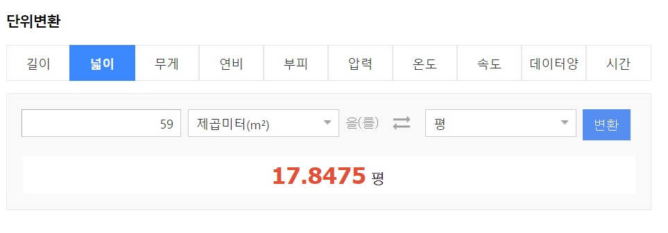 반대로 59m2를 평수로 전환하니 17.8475평으로 약 18평임을 알 수 있습니다.